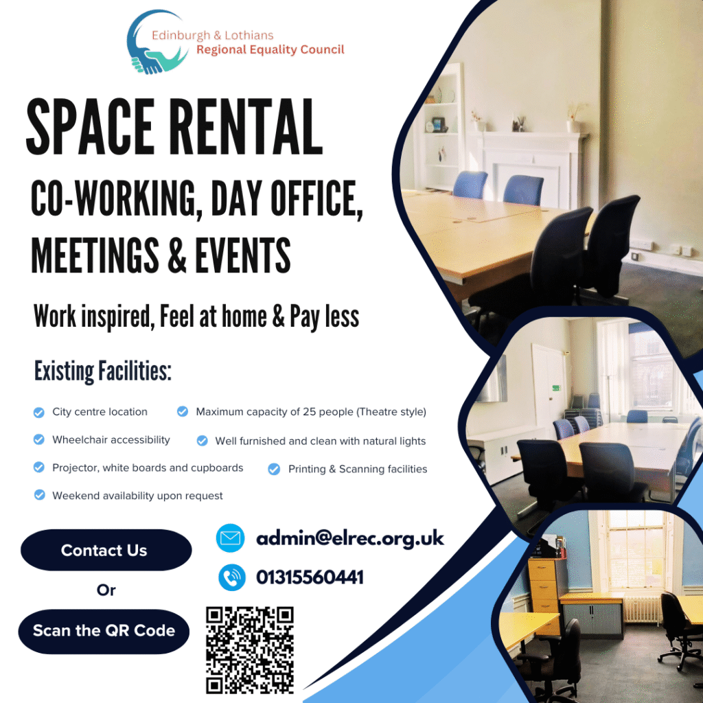 Exciting news! We now have spaces available to rent at our premise. Be a part of our supportive network and grow your impact together! ELREC, 14 Forth Street, Edinburgh, EH1 3LH 01315560441 admin@elrec.org.uk For more details and booking, get in touch through above contact details or scan the QR code