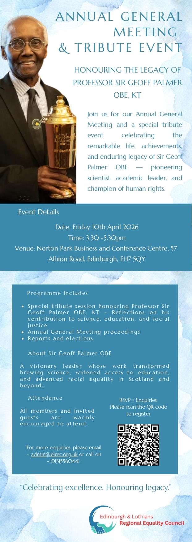 Join us for our Annual General Meeting and a special tribute event celebrating the life and legacy of Professor Sir Geoff Palmer OBE, KT. Together, we honour a pioneering scientist, visionary leader, and champion of human rights whose impact continues to inspire generations.