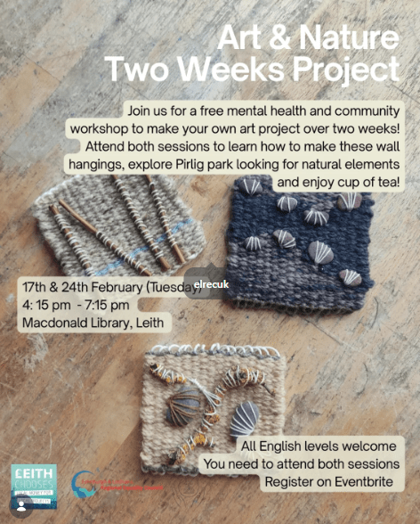 24th February (Tuesday) 4:00 pm – 7:15 pm, meeting point at Pilrig Park (Meeting point here: https://maps.app.goo.gl/mi18JgoeSv67ESq38) where we will collect natural elements to use on our wall hangings, and walk towards the Macdonald Library