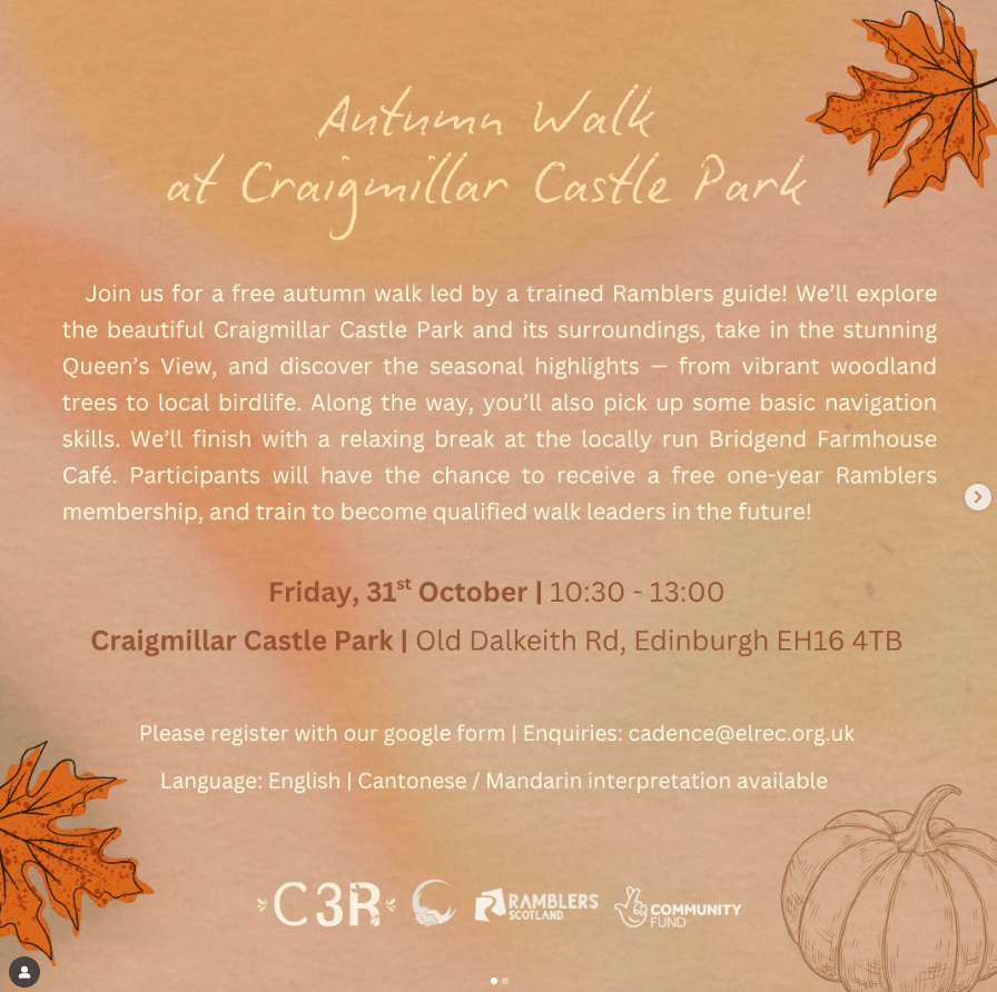 跟我們一起出外走走,進行免費的秋季健行吧!🍁🍂 在專業的Ramblers導遊帶領下,我們將走訪美麗的克雷格米勒城堡公園,欣賞迷人的女王景觀,探索綺麗林木與野生鳥類的季節魅力。途中還能學習簡單的定向技巧,並於在地經營的布里金德農舍咖啡館放鬆作結。參加者將有機會獲得一年的Ramblers免費會籍,且接受培訓,成為未來的健行領隊! 🧡