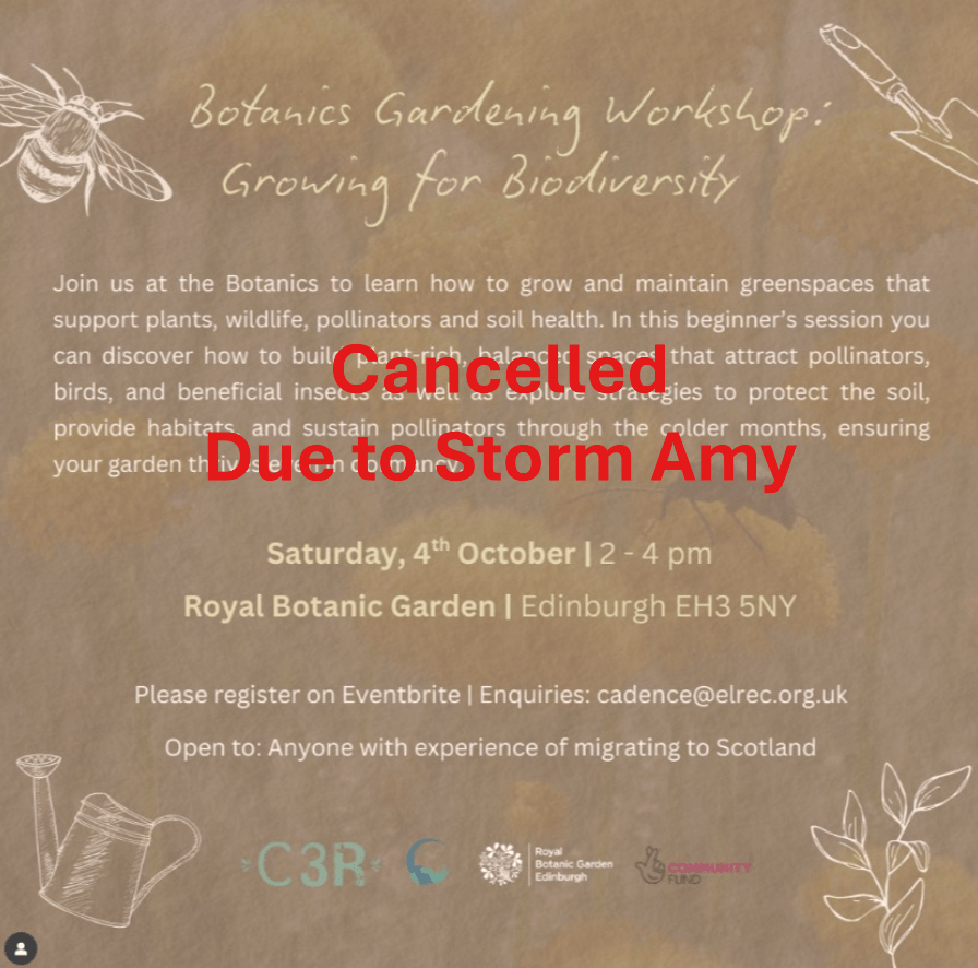 We regret to inform that the C3R Project event, “Botanics Gardening Workshop” scheduled for tomorrow has been cancelled due to a Yellow Weather Warning for Storm Amy. Please stay safe and stay tuned for updates on future events.