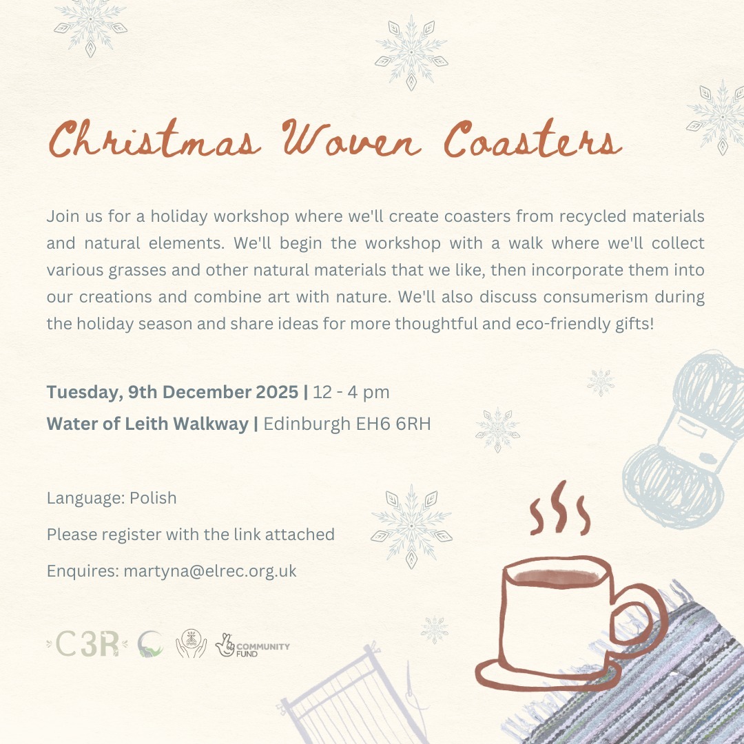Dołącz do nas na świąteczne warsztaty, podczas których będziemy tworzyć podkładki pod kubek z materiałów pochodzących z recyklingu oraz elementów naturalnych. ☕ Warsztaty rozpoczniemy spacerem, podczas którego będziemy zbierać różne trawy i inne naturalne materiały, które nam się spodobają, aby później wpleść je w nasze prace i połączyć sztukę z naturą.