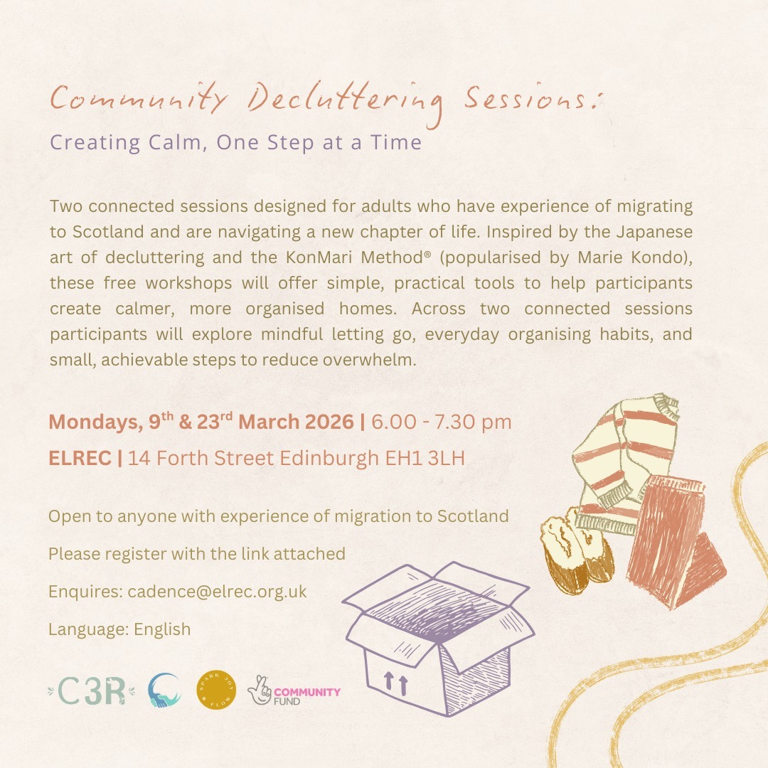 Two connected sessions designed for adults who have experience of migrating to Scotland and are navigating a new chapter of life. đŸŒ» Inspired by the Japanese art of decluttering and the KonMari Method® (popularised by Marie Kondo), these free workshops will offer simple, practical tools to help participants create calmer, more organised homes. Across two connected sessions on 9th and 23rd March (Mondays), participants will explore mindful letting go, everyday organising habits, and small, achievable steps to reduce overwhelm.