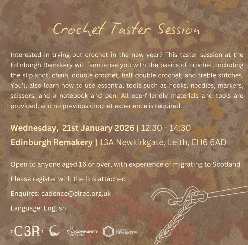 Interested in trying out crochet in the new year? 🧶 This taster session at the Edinburgh Remakery will familiarise you with the basics of crochet, including the slip knot, chain, double crochet, half double crochet, and treble stitches. You’ll also learn how to use essential tools such as hooks, needles, markers, scissors, and a notebook and pen. All eco-friendly materials and tools are provided, and no previous crochet experience is required 🌼