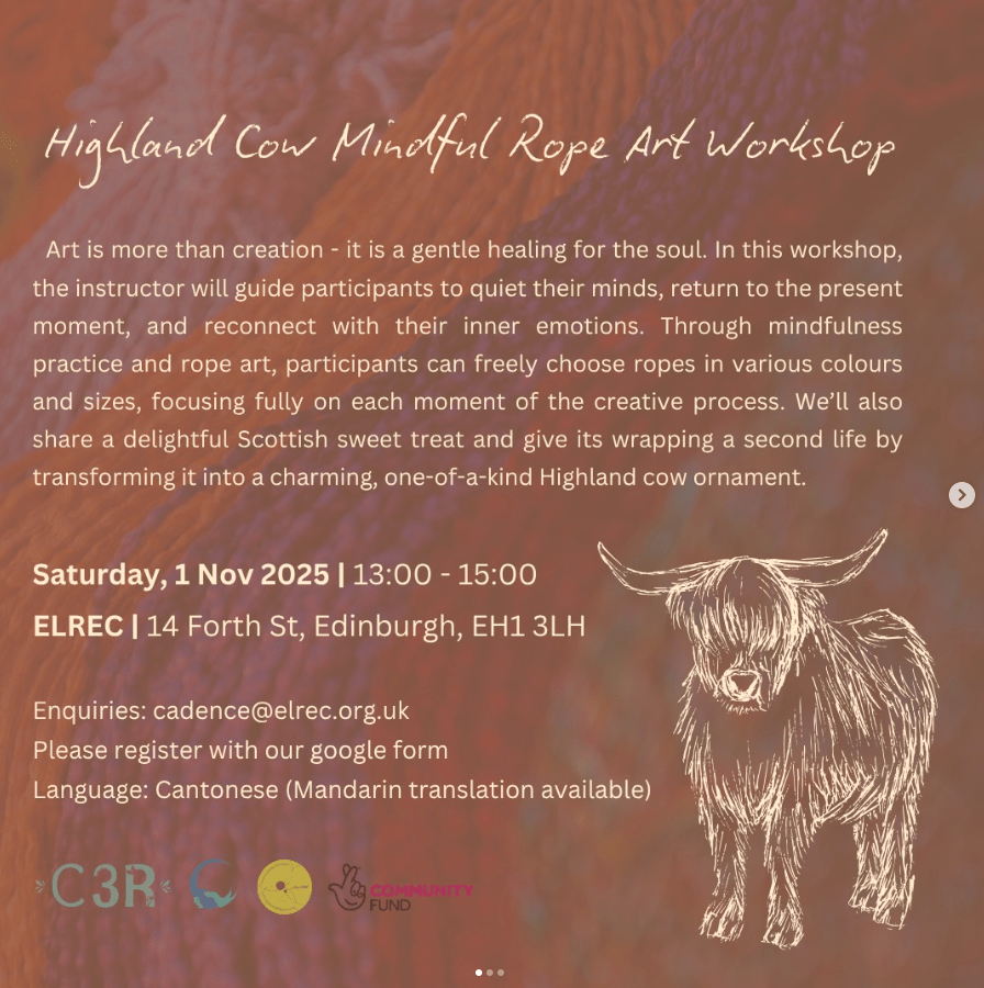 Art is more than creation—it is a gentle healing for the soul. In this workshop, the instructor will guide participants to quiet their minds, return to the present moment, and reconnect with their inner emotions 🌻Through mindfulness practice and rope art, participants can freely choose ropes in various colours and sizes, focusing fully on each moment of the creative process. We’ll also share a delightful Scottish sweet treat and give its wrapping a second life by transforming it into a charming, one-of-a-kind Highland cow ornament 🐮