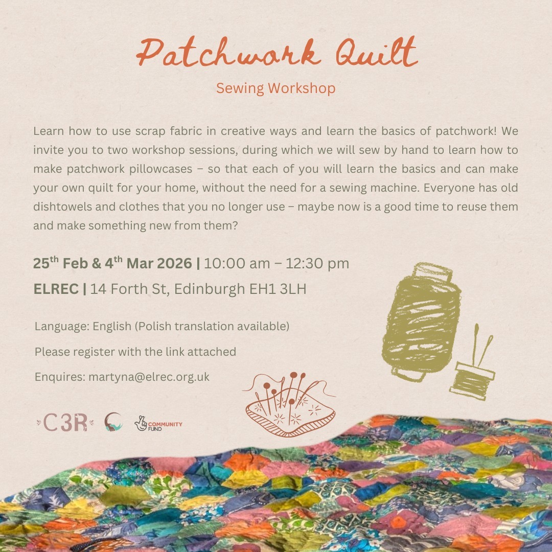 Learn how to use scrap fabric in creative ways and learn the basics of patchwork! 🧵 🛏️We invite you to two workshop sessions, during which we will sew by hand to learn how to make patchwork pillowcases – so that each of you will learn the basics and can make your own quilt for your home, without the need for a sewing machine. Everyone has old dishtowels and clothes that you