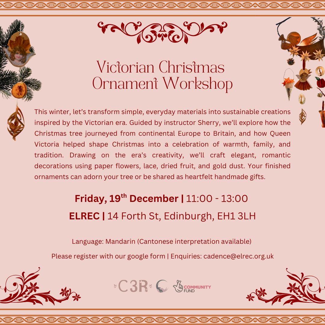 Guided by instructor Sherry, we’ll explore how the Christmas tree journeyed from continental Europe to Britain, and how Queen Victoria helped shape Christmas into a celebration of warmth, family, and tradition. Drawing on the era’s creativity, we’ll craft elegant, romantic decorations using paper flowers, lace, dried fruit, and gold dust. Your finished ornaments can adorn your tree or be shared as heartfelt handmade gifts.